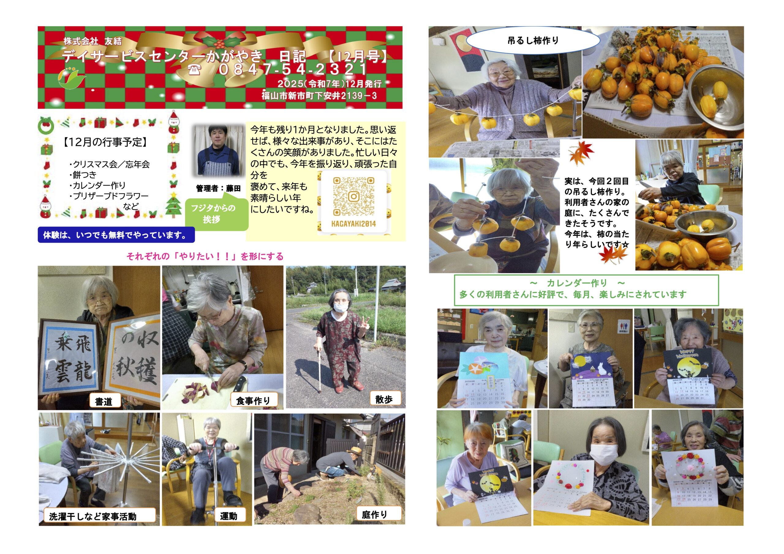カレンダー作りデイサービスセンター吊るし柿作り家事活動庭作り散歩書道運動食事作り
