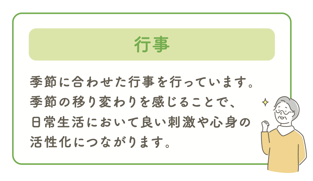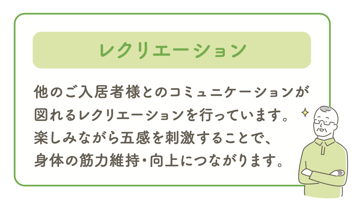 他のご入居者様とのコミュニケーションが図れるレクリエーションを行っています。楽しみながら五感を刺激することで、身体の筋力維持・向上につながります。