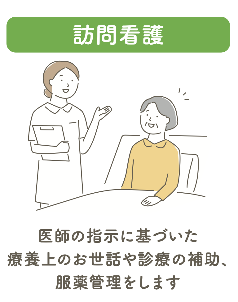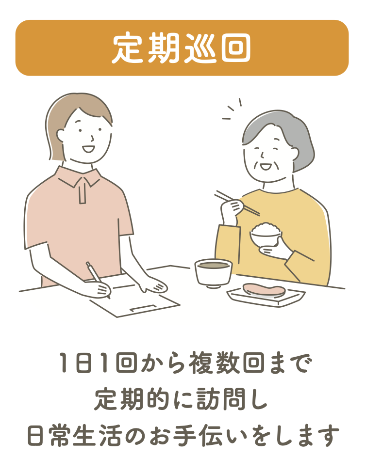 日中夜間を通じて24時間365日、生活に合わせて必要な訪問介護看護サービスを提供します。定期的な訪問だけではなく、必要なときに随時サービスを受けることも可能です。