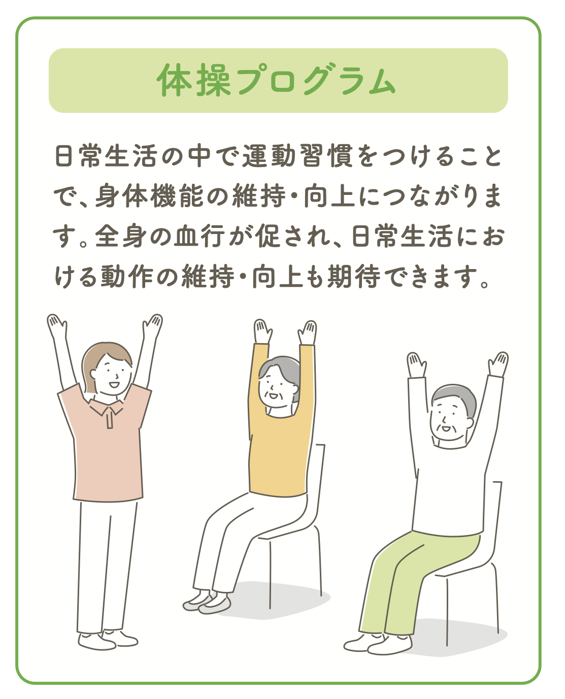 で、身体機能の維持・向上につながります。全身の血行が促され、日常生活における動作の維持・向上も期待できます。